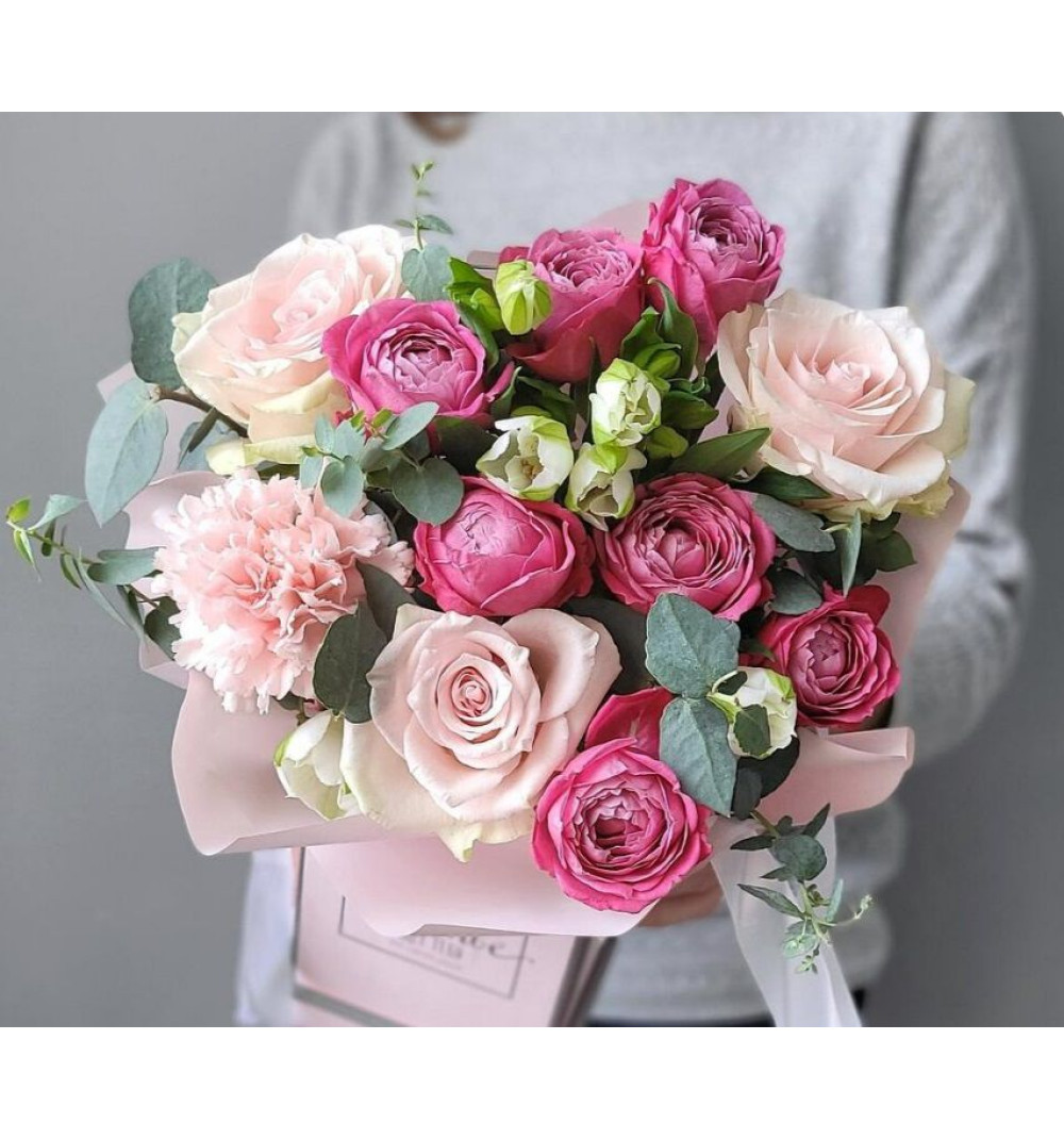 Композиция с розами, пионовидными кустовыми розами и альстромерией - это изысканный и элегантный букет, который привлекает внимание своим разнообразием цветов и форм. Розы, с их изящными лепестками, символизируют любовь и красоту. Пионовидные кустовые розы добавляют в букет объемности и роскоши, а альстромерия своими мелкими цветками придает ему нежность и легкость. Эта композиция будет прекрасным подарком для особых моментов и создаст атмосферу уюта и радости в любом интерьере.