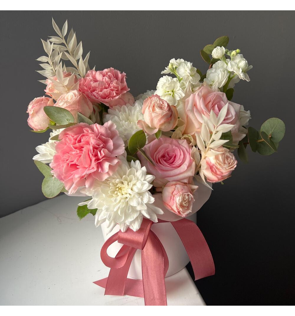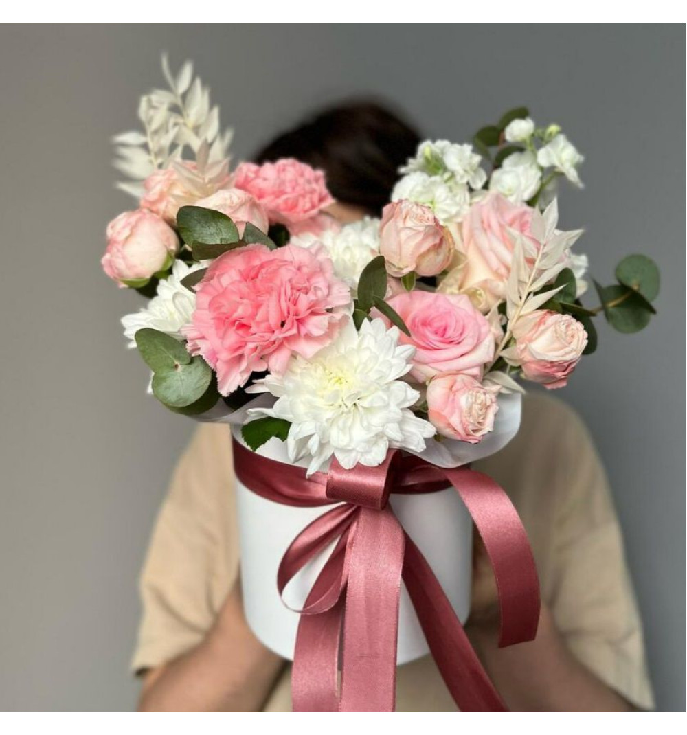 Купить Кустовые пионовидные розы, маттиола и хризантема в шляпной коробочке в Караганде за 15 000 ₸ | интернет-магазин «Guls»