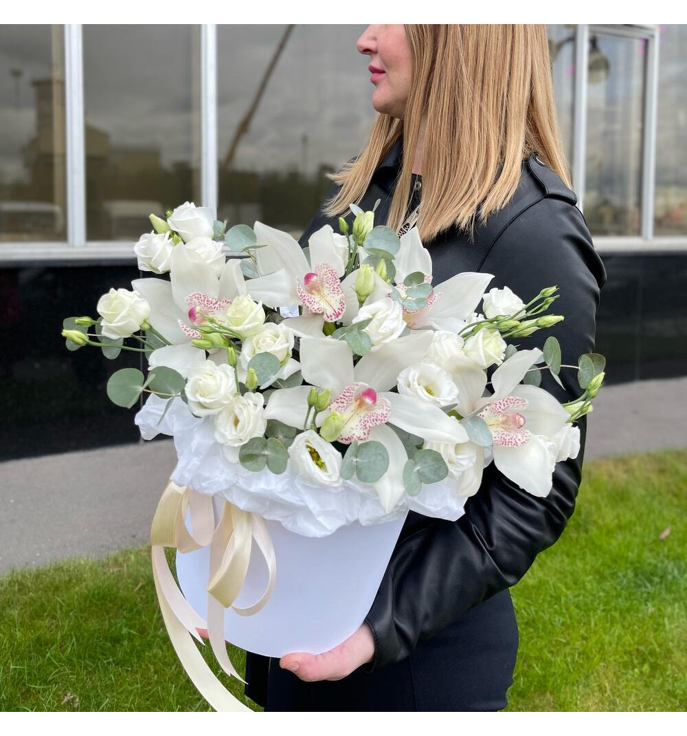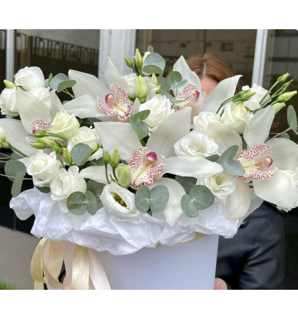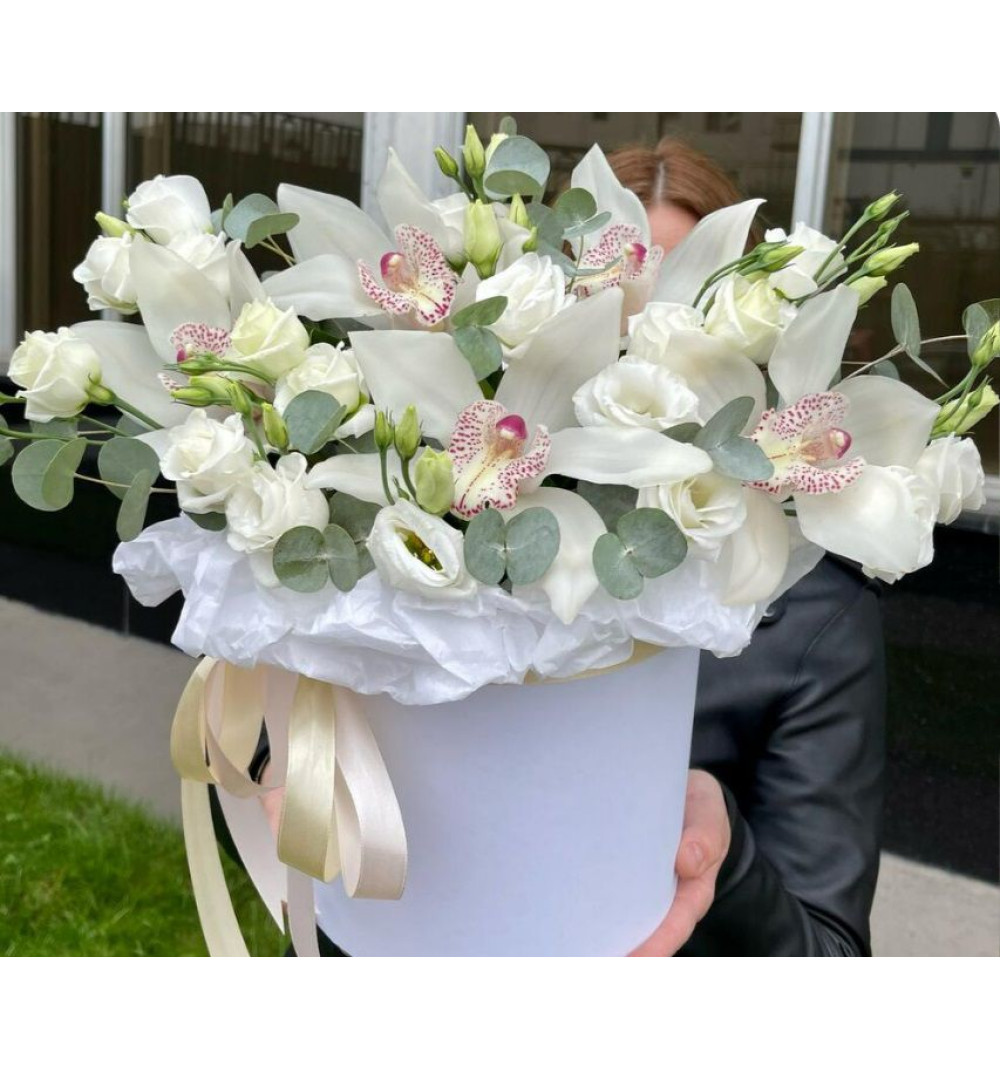 Купить Орхидея белая с эустомой в коробочке в Караганде за 25 000 ₸ | интернет-магазин «Guls»
