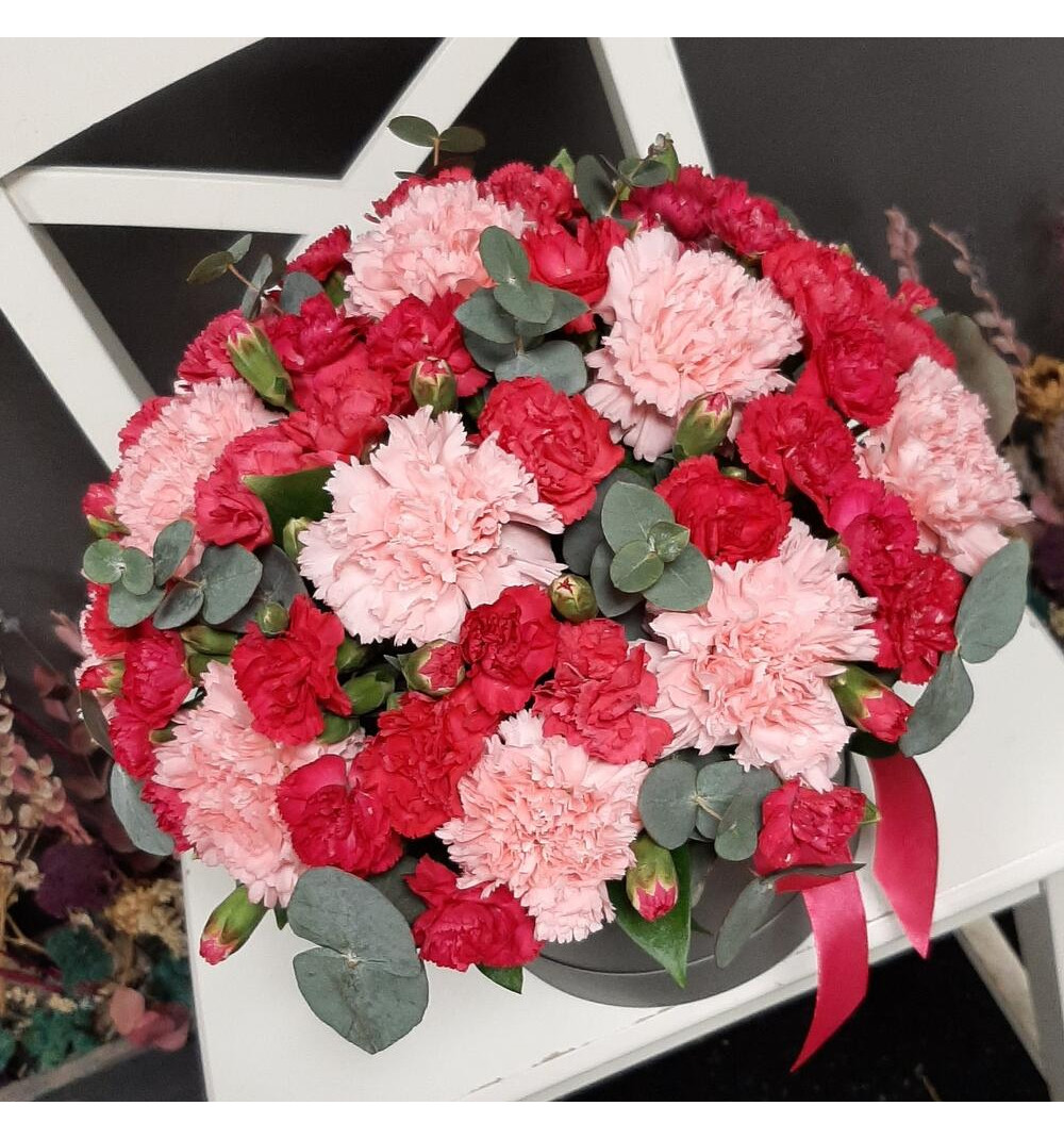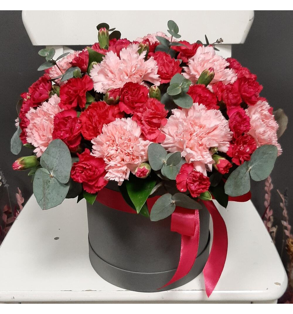 Купить Яркая кустовая и нежно коралловая гвоздика в шляпной коробке в Караганде за 25 000 ₸ | интернет-магазин «Guls»