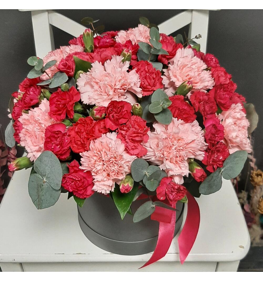 Яркая кустовая и нежно коралловая гвоздика в шляпной коробке